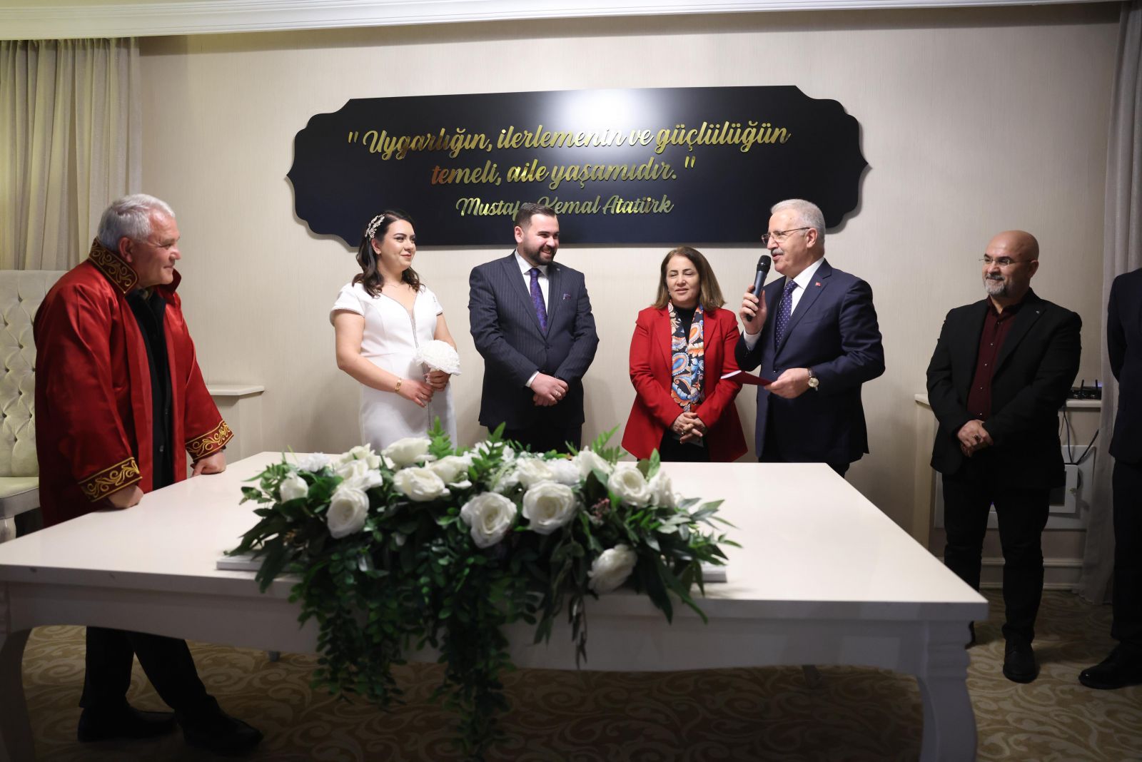 Nikâh sonrası konuşma yapan 65. Dönem Ulaştırma, Denizcilik ve Haberleşme Bakanı Ahmet Arslan, genç çifte bir ömür boyu mutluluklar dileyerek evliliğin önemine vurgu yaptı. Arslan, Mevlana’nın