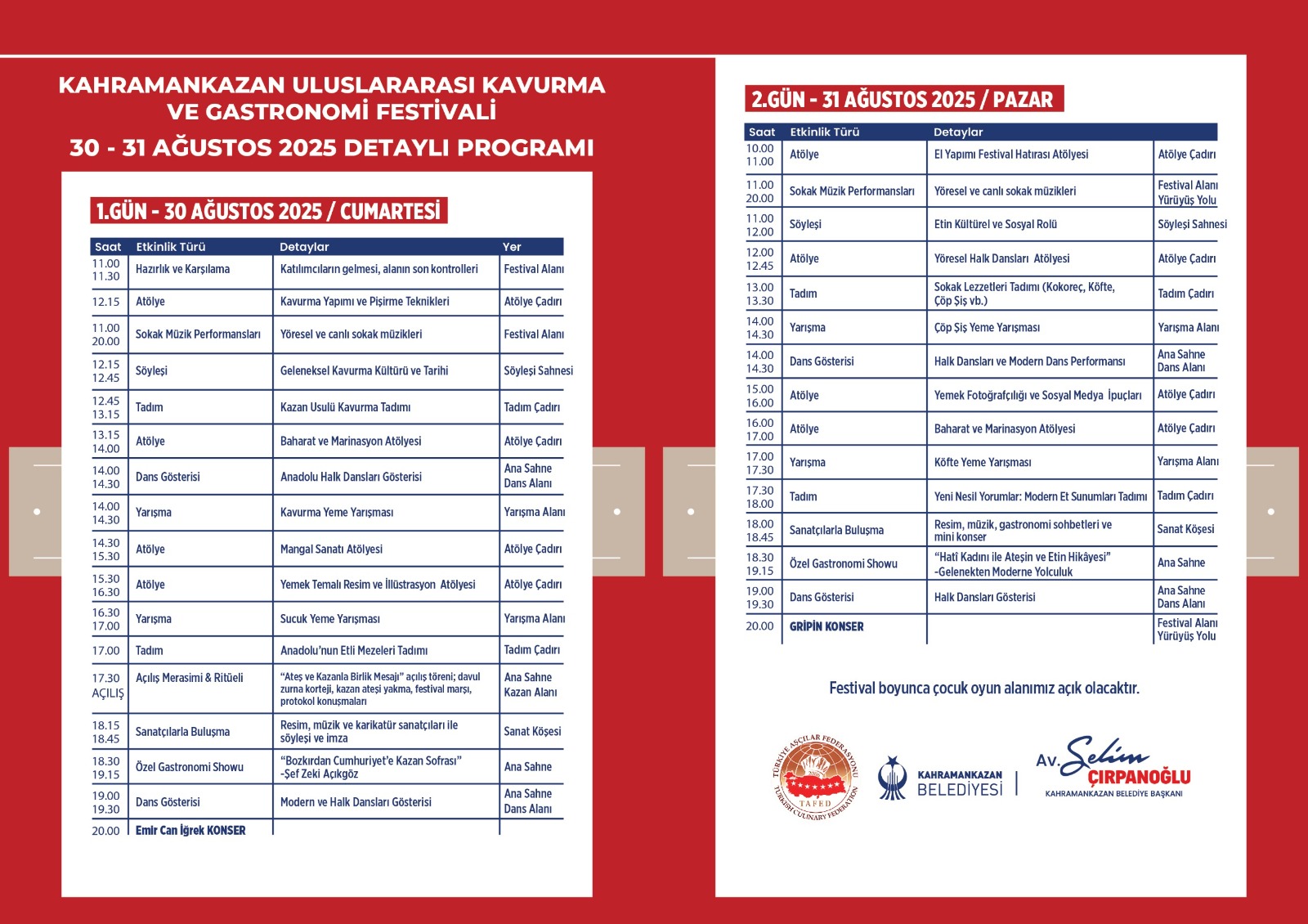 Festivalin ilk günü olan 30 Ağustos Cumartesi, saat 15.30’da Belediye Başkanı Selim Çırpanoğlu ile Türkiye Aşçılar Federasyonu Genel Başkanı Zeki Açıkgöz ortak basın açıklaması yapacak. Açılış programı ise saat 17.30’da ABB Başkanı Mansur Yavaş ve protokol üyelerinin katılımıyla gerçekleşecek. Açılış konuşmaları hem televizyonlardan hem de sosyal medyadan canlı yayınlanacak.