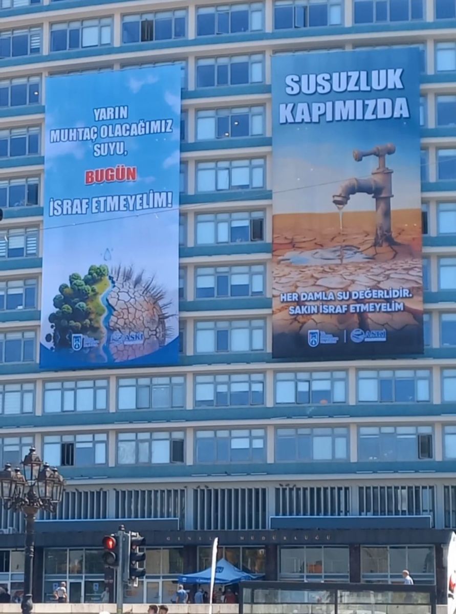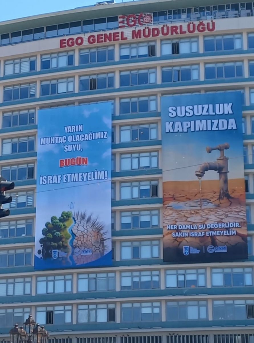 Ankara’da su kaynaklarının azalması nedeniyle susuzluk tehlikesi kapıda. Ankara Büyükşehir Belediyesi (ABB), artan su tüketimi ve azalan baraj doluluk oranları nedeniyle harekete geçti. Ulus’ta bulunan EGO Genel Müdürlüğü binasına büyük bir afiş asarak vatandaşlara dikkat çeken bir mesaj verdi.