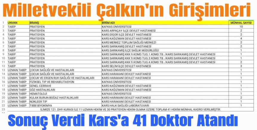 Milletvekili Adem Çalkın, yaptığı açıklamada, "Kars’ımızın sağlık altyapısını güçlendirmek için çalışmalarımıza devam ediyoruz. 41 yeni doktor ataması ile vatandaşlarımızın sağlık hizmetlerine erişimi daha da kolaylaşacak. Hayırlı olsun." ifadelerini kullandı.