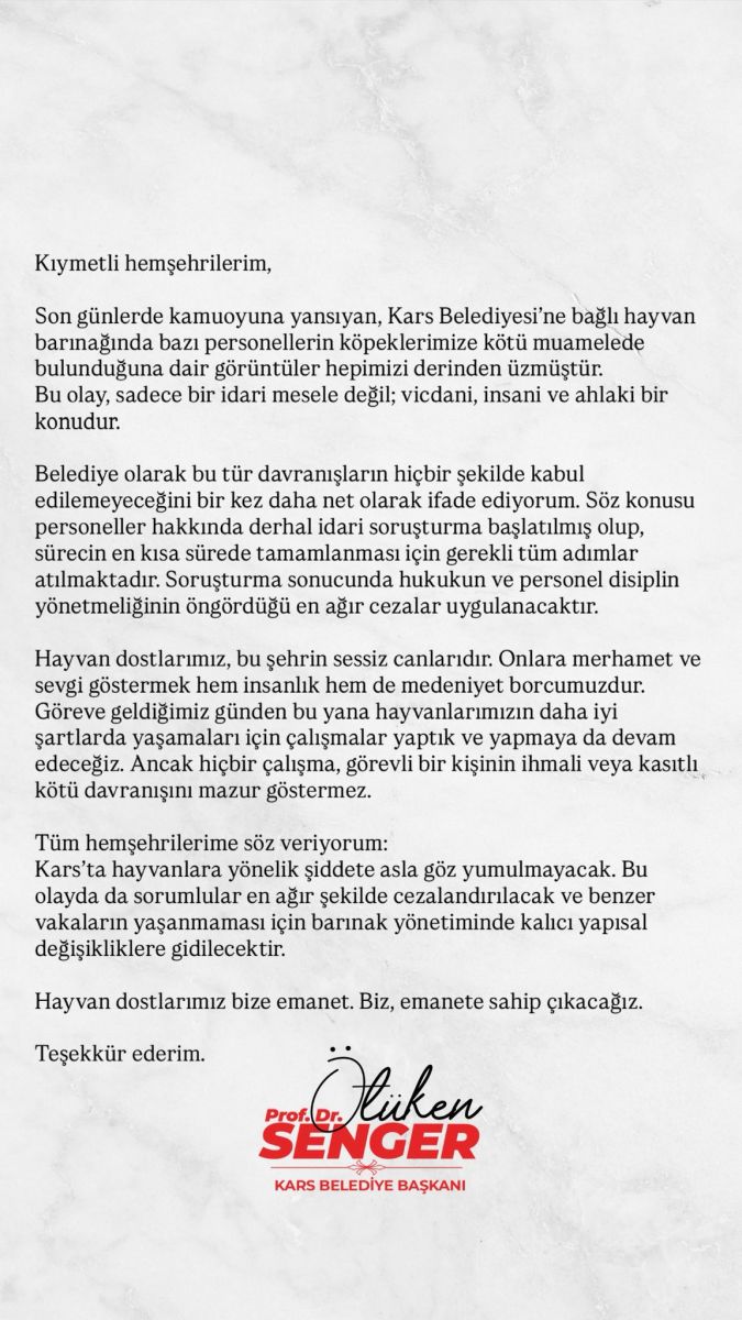 Kars Belediyesi, hayvanlara yönelik şiddetin asla tolere edilmeyeceğini ve bu konuda kararlı olduklarını bir kez daha kamuoyuna ilan etti.