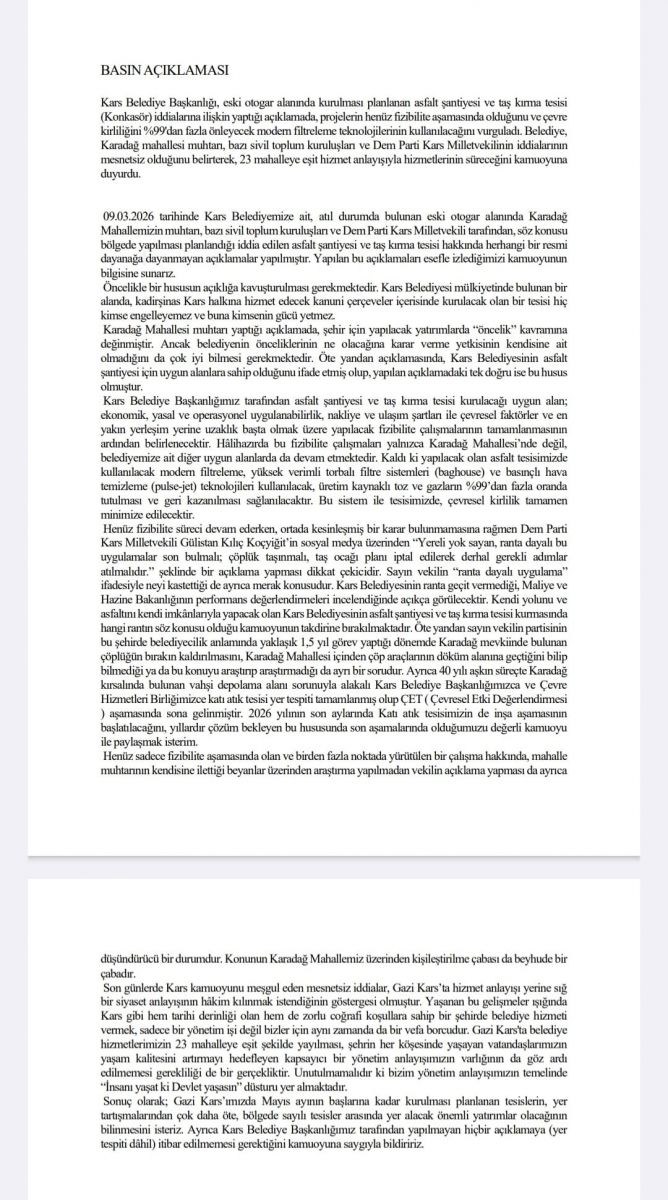 Açıklamada, 09 Mart 2026 tarihinde bazı sivil toplum kuruluşları, Karadağ Mahallesi muhtarı ve DEM Parti Kars Milletvekili tarafından söz konusu bölgede yapılması planlanan asfalt şantiyesi ve taş kırma tesisi hakkında açıklamalar yapıldığı ifade edildi. Kars Belediyesi tarafından yapılan değerlendirmede, bu açıklamaların herhangi bir resmi dayanağa dayanmadığı belirtildi.