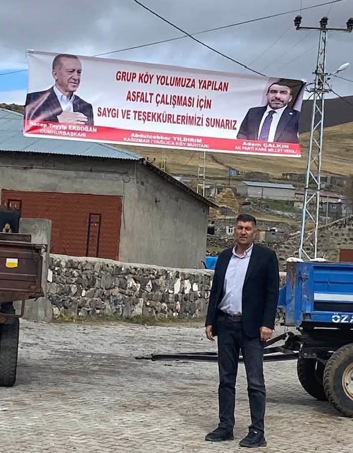 Kars’ın Digor ilçesine bağlı Yağlıca Köyü’nde örnek bir teşekkür davranışı sergilendi. Köy muhtarı Rıfat, köy yollarının asfaltlanması ve parke taşı döşenmesi hizmetlerinin ardından köy girişine hazırlattığı afiş ile Cumhurbaşkanı Recep Tayyip Erdoğan ve AK Parti Kars Milletvekili Adem Çalkın’a teşekkür etti.